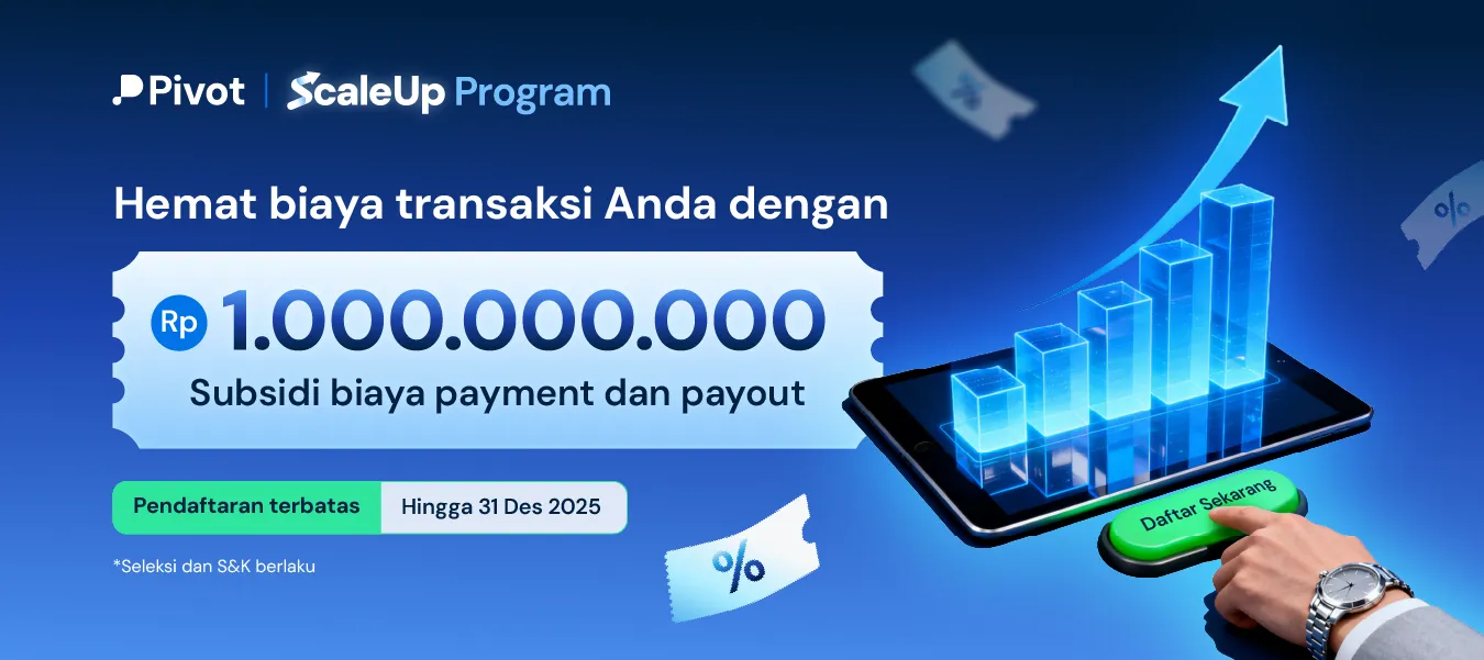 Bagi bisnis yang mendaftar dan bergabung dengan Pivot di antara 1 September hingga 31 Desember 2025 akan mendapatkan subsidi biaya transaksi payment dan payout sebesar Rp 1.000.000.000 selama 1 tahun (penawaran terbatas, T&C berlaku).